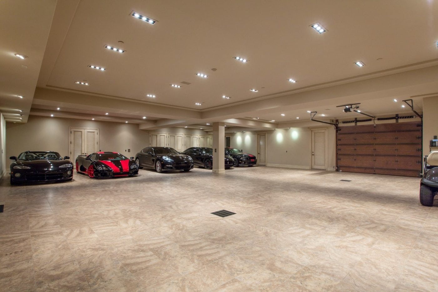 Mansion garage full of expensive cars.